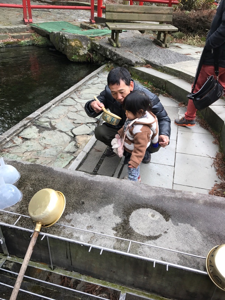 湧き水をじーじに飲まされる1歳児。